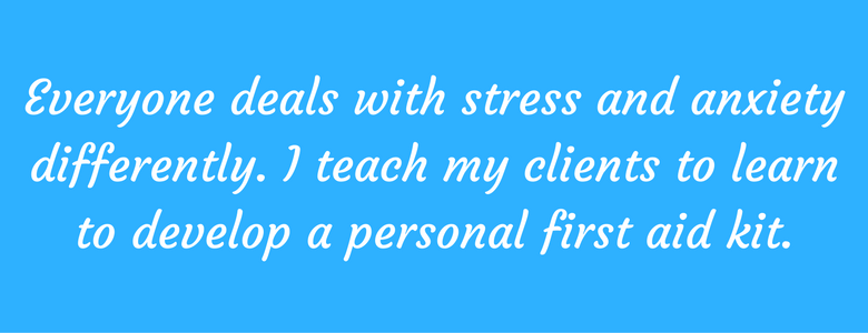 Everyone deals with stress and anxiety differently. I teach my clients to learn to develop a personal first aid kit. It can be a notebook, a binder, or a file on your computer. Your first aid kit needs to have a list of things that you like to do that help you recharge. Click here to see my first aid kit (coming in 2017) Your first aid kit must be broken up into different categories from daily, monthly, yearly.