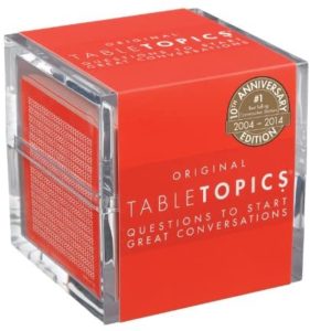 Table Topics are a card deck that has different questions on them. The goal of the deck is to pull a card and ask each other questions. These are always open-ended questions; thus it creates a deeper conversation.